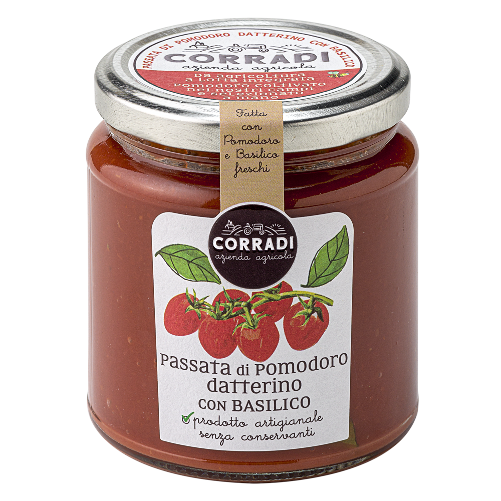 La nostra passata di datterino e basilico è frutto di una filiera corta, controllata e garantita: dalla semina alla raccolta fino al laboratorio di trasformazione, per una passata genuina e sana fatta solo con datterini e basilico freschi dei nostri campi.